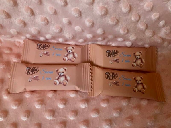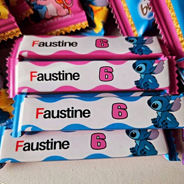 stickers gobelets, étiquettes bouteilles, Smarties, Kinder bueno, kit Kat, M&ms, Kinder country, Kinder maxi, caprisun, sachet de Haribo, chips, mini pot de Nutella, skittles, springles....