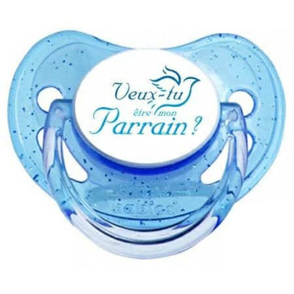 Pour une demande originale et pleine de tendresse ! La sucette personnalisée veux-tu être mon parrain saura plaire au futur parrain... Toutes nos sucettes sont sans BPA et conformes à la norme européenne EN 1400.